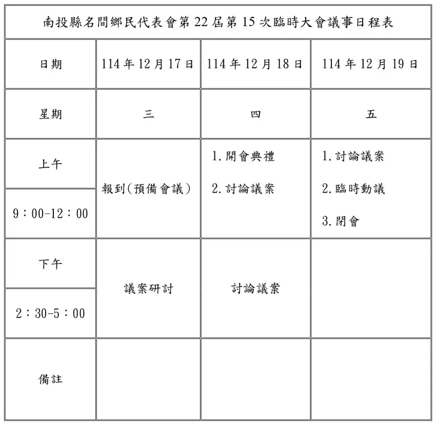 第22屆第15次臨時會議日程表